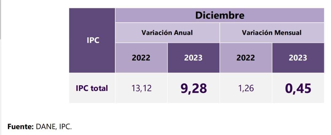 El pasado martes 9 de Enero el DANE dio a conocer la variación anual del IPC del 2023, el cual cerro con el 9.28%. Esto quiere decir que, de acuerdo al Ministro de Hacienda, Ricardo Bonilla, la inflación estuvo por debajo a la esperada.